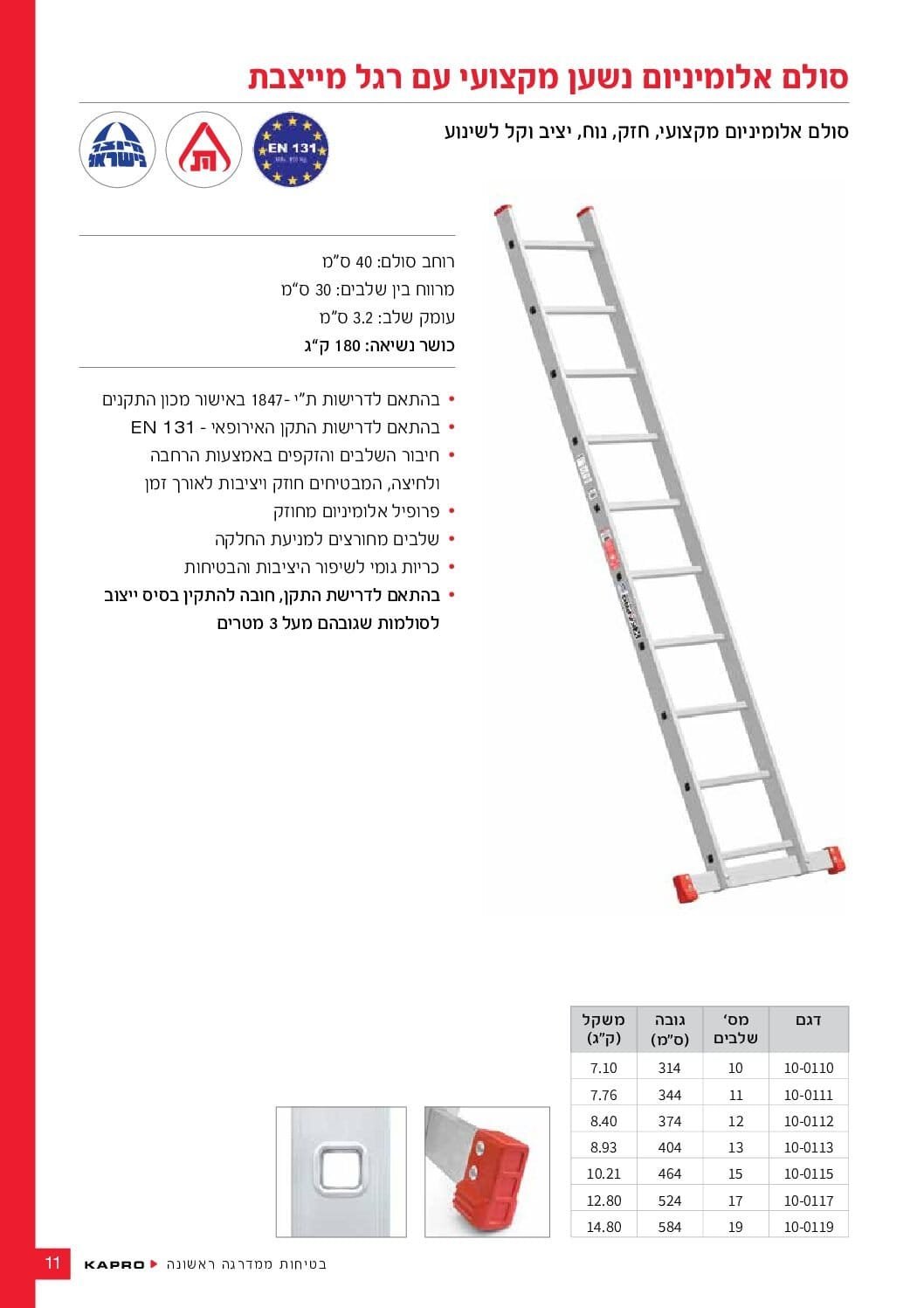 סולם אלומיניום נשען – מקצועי וקל משקל – סולם אלומיניום מקצועי, חזק, נוח, יציב וקל לשינוע. חיבור השלבים והזקפים נעשה באמצעות הרחבה ולחיצה, המבטיחים חוזק ויציבות לאורך זמן. פרופיל אלומיניום מחוזק עם שלבים מחורצים למניעת החלקה. לשיפור היציבות והבטיחות ישנן כריות גומי. הסולם עומד בהתאם לדרישות ת”י 1847 | בהתאם לדרישות התקן האירופאי – 131 EN